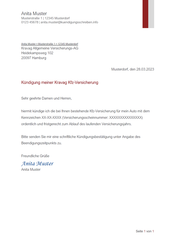 Kündigungsschreiben Kravag Kfz-Versicherung